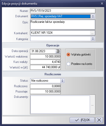 Po uzupełnieniu pól w formularzu (Kontrahent, Data operacji, wartość walutowa), zatwierdzamy tworzony zapis. Uwaga data operacji musi być zgodna z otwartym rejestrem kasowym.