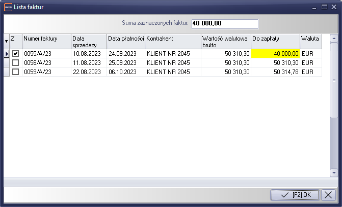 W kolumnie "Z" zaznaczamy faktury które zamierzamy rozliczyć. W kolumnie "Do zapłaty", dla faktur zaznaczonych pole zostanie podświetlone na kolor żółty. Oznacza to że pole możliwe jest do edytowania. W polu można zmienić wartość zapłaty za daną fakturę, niezależnie od wartości zapisu bankowego. W celu zmiany wartości należy w polu wprowadzić nową wartość. Po zmianie wartości pole "Suma zaznaczonych faktur", zostanie odpowiednio zmodyfikowana.