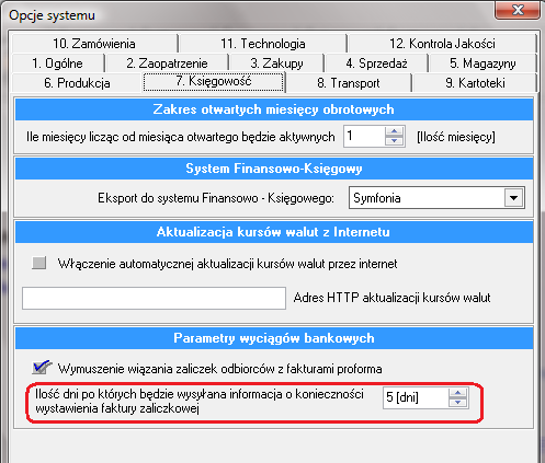 Rysunek 859 Opcja definicji ilości dni po których będzie wysyłana informacja do właściciela faktury proforma o konieczności rozliczenia zaliczki
