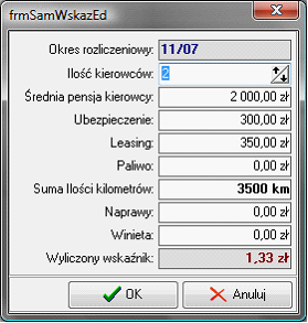 W pole średnia pensja kierowcy system automatycznie wpisze wartość zdefiniowaną w liście kierowców. Po wypełnieniu pozycji wskaźnik zostaje naliczony automatycznie.