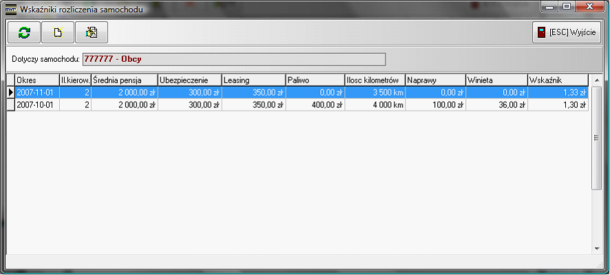 Po uruchomieniu funkcji, pojawi się okno z wyliczonymi wskaźnikami dla danego pojazdu w różnych okresach rozliczeniowych.