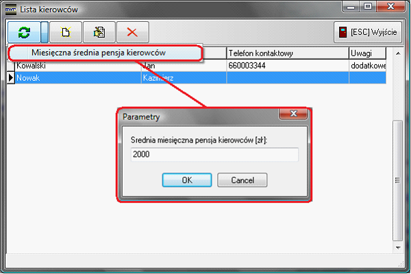 Wskaźniki wyliczane są osobno dla każdego samochodu oraz dla odpowiedniego okresu rozliczeniowego. System pozwala na rozliczenia w okresach miesięcznych, zatem wskaźniki powinny być przygotowane przed rozpoczęciem rozliczeń tras dla okresu rozliczeniowego, dla którego zamierzamy wykonać rozliczenie. Pierwszą czynnością którą wykonamy, będzie wprowadzenie średniej wartości pensji kierowców. Opcję tą definiujemy po to, aby system podczas tworzenia wskaźników sam podpowiadał tą wartość. Opcję dodajemy w liście kierowców.
