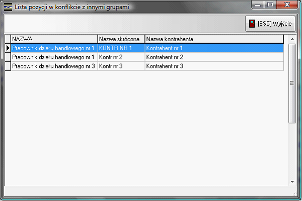 Podczas zaznaczania opcji system sprawdza, czy zawarta w grupie lista kontrahentów jest unikalna, czyli czy pozycje grupy nie występują już w innych grupach. Jeśli pozycje będą występowały w innych grupach, system nie dopuści do zaznaczenia opcji. W celu kontroli, które pozycje powielają się w innych grupach została utworzona odpowiednia funkcja kontrolna. Funkcję uruchamiany z paska narzędzi listy grup kontrahentów (F3).