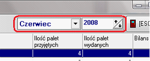 W dolnym panelu widoczne są trzy pola, które zawierają sumaryczne ilości palet wszystkich kontrahentów w danym miesiącu. Odpowiednio od lewej to suma palet przychodzących, suma palet wydanych oraz suma bilansu palet.