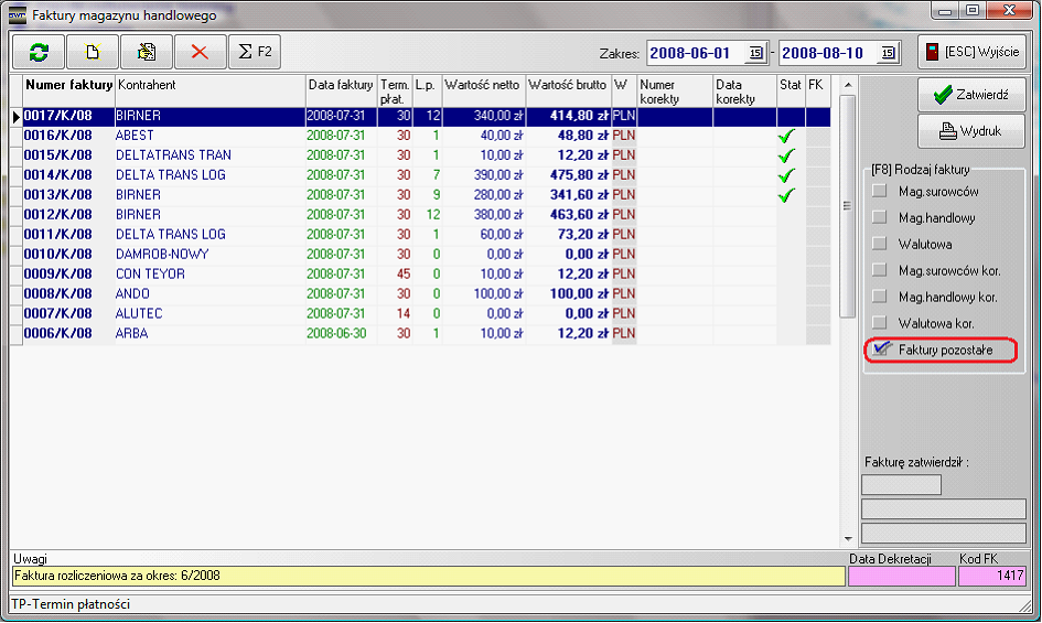 Po uruchomieniu, system przejdzie do przeglądu faktur sprzedaży, ograniczając operacje jedynie do jednego rodzaju faktury „Faktur y pozostałe”.