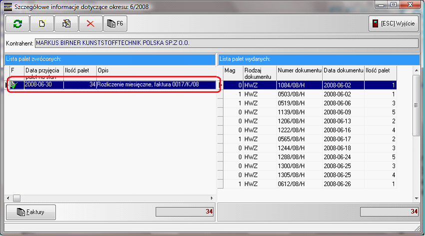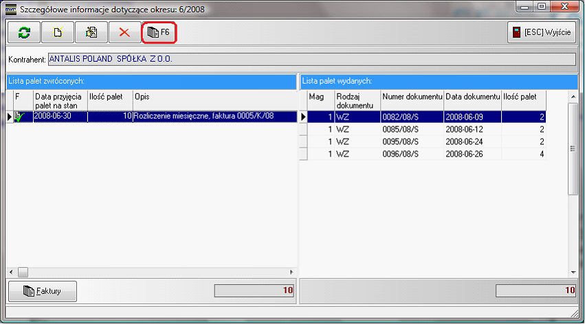 Fakturę rozliczeniową wystawia się z poziomu rejestru palet, w oknie informacji szczegółowych kontrahenta. Do tego celu służy klawisz „F6”.