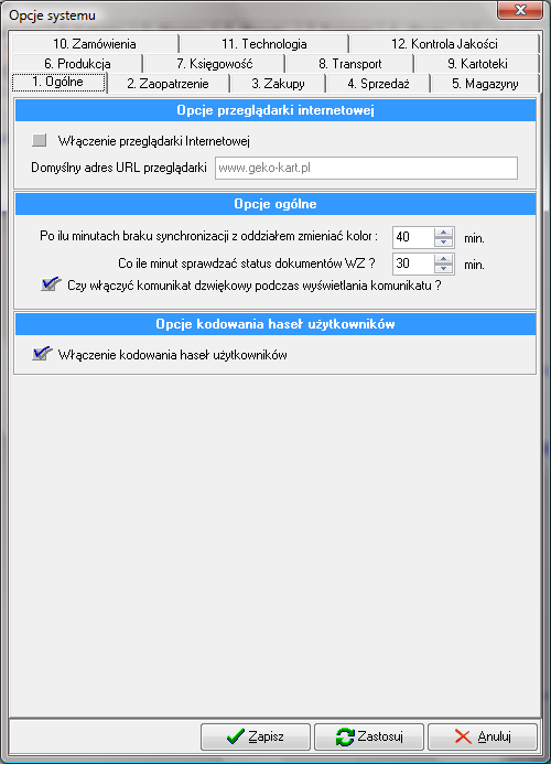 - "Włączenie kodowania haseł użytkowników". Po włączeniu opcji wszystkie hasła użytkowników w bazie danych, zostaną zakodowane. Zmiana opcji możliwa tylko dla super użytkownika.