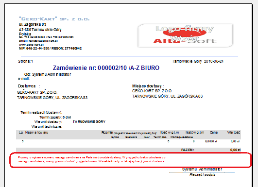 Informacja umieszczana na zamówieniu do dostawcy. Możliwość definicji informacji w trzech językach, polskim, angielskim i rosyjskim. Wybór języka umieszczanego na zamówieniu zależne jest od konfiguracji języka w kartotece kontrahenta.
