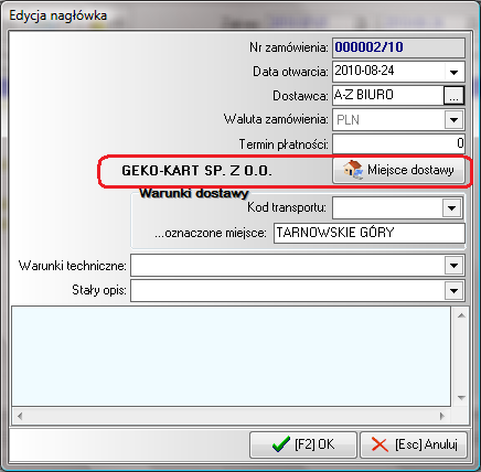 - Domyślne miejsce dostawy w zamówieniu zewnętrznym do dostawcy. Określa miejsce dostarczenia towaru przez dostawcę w przypadku wielu miejsc docelowych własnych.