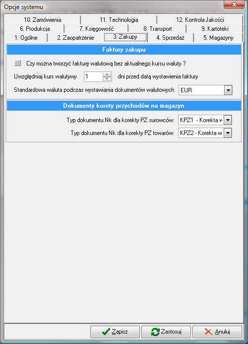 - "Typ dokumentu Nk dla korekty PZ surowców:". Definicja typu dokumentu jaki będzie generowany podczas zatwierdzania dokumentu korekty PZ w magazynie surowców. Dokument Nk- jest generowany w celu ewidencji odchyłki kosztów zakupu towarów użytych do produkcji lub już sprzedanych.