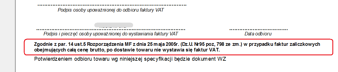 Dodatkowe informacje pojawiające się w stopce faktury zaliczkowej. Informacje zdefiniowane w języku polskim, angielskim i rosyjskim. Informacja polska pojawia się zawsze na fakturze. Informacje w językach angielskim lub rosyjskim pojawiają się zależnie od konfiguracji języka w kartotece klienta.