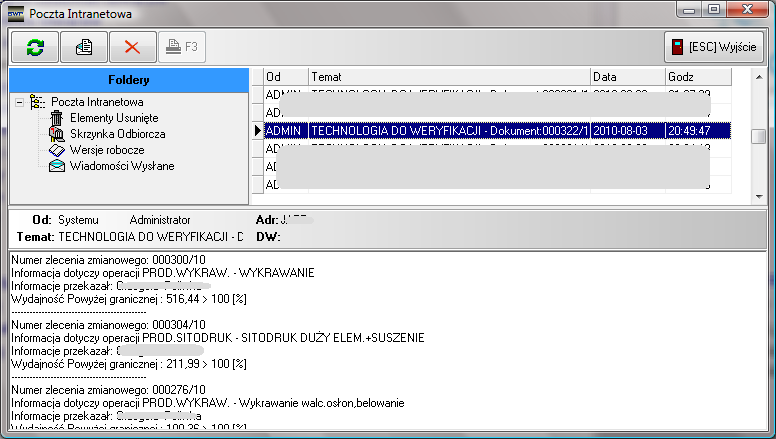 - "Włączenie kontroli wydajności operacji zleceń zmianowych". Włączenie opcji spowoduje, że system będzie kontrolował wykonanie ostatniej tego typu operacji. Jeśli wykonana ostatnio operacja nie będzie mieściła się w zakresie zdefiniowanych parametrów, system zaznaczy pozycję zlecenia odpowiednim znakiem graficznym i wyśle informacje do zdefiniowanej grupy. Informacja będzie zawierała treść "TECHNOLOGIA DO WERYFIKACJI".