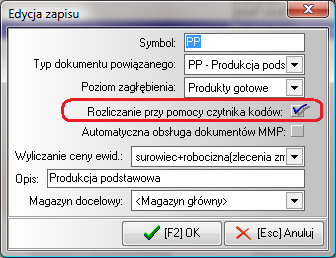 - "Rozliczanie materiałów surowcowych przy pomocy czytnika kodów". Włączenie opcji spowoduje, wprowadzanie trybu rozliczania surowców pobranych do produkcji przy pomocy skanera. Zlecenia produkcyjne muszą należeć do ośrodka kosztów ze zdefiniowanym wskaźnikiem obsługi przy pomocy kodu czytnika.