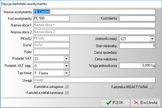 Kolejnym krokiem, będzie utworzenie kartotek materiałów przeznaczonych do produkcji formy. Kartoteki wprowadzamy w standardowy sposób z poziomu zakładki "Kartoteki->Asortymen surowcowy".