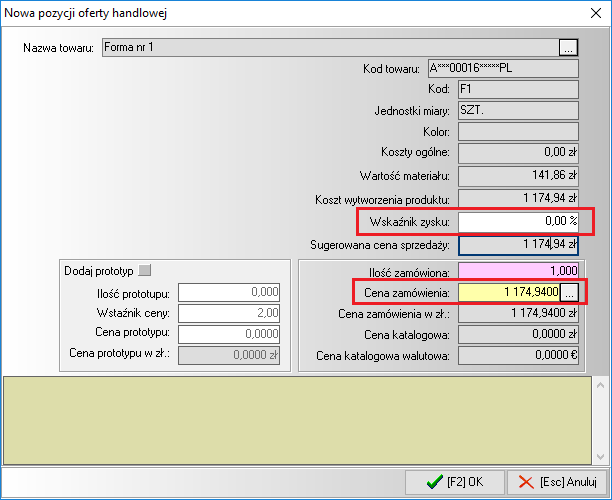W oknie formularza edycji pozycji oferty, możemy zmienić wskaźnik zysku, jak również zmodyfikować ostateczną cenę formy. Po zatwierdzeniu formularza klawiszem OK. zakończymy proces tworzenia pozycji oferty dotyczącej formy.