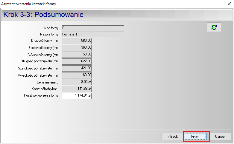 W oknie podsumowania pojawi nam się komplet informacji dotyczących definiowanej formy. Pozostaje naciśnięcie klawisza "Finish" i przejście do formularza edycji pozycji oferty.