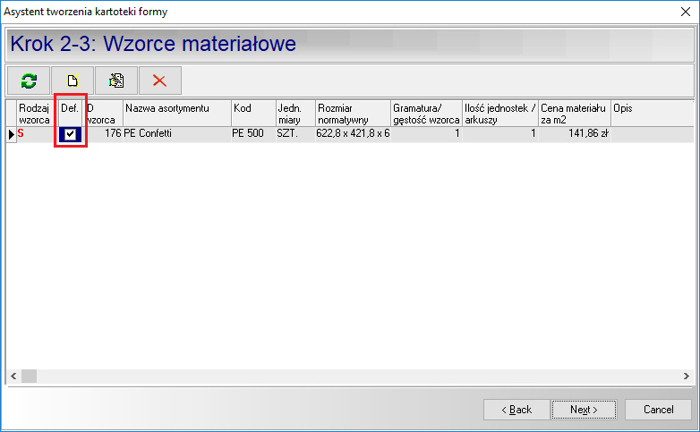 Po potwierdzeniu okna edycji pojawi się materiał w liście wzorców. Należy wybrać pozycję jako domyślną i przejść do podsumowania.