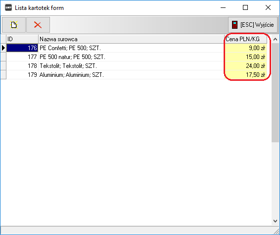 Lista umożliwia zdefiniowanie ceny materiału dla formy.