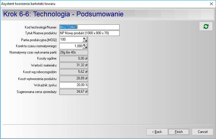 W końcowym etapie mamy gotową technologię z wyliczeniami materiału oraz kosztów produkcji.