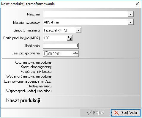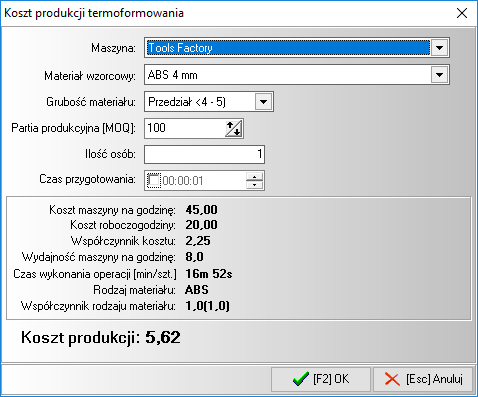 Zostanie ustawiony materiał wzorcowy, jeśli jest większa ilość materiałów w liście należy ustawić taki aby określał prawidłową grubość materiału. Grubość materiału została również ustawiona automatycznie na podstawie materiału wzorcowego. W celu wyliczenia kosztu produkcji należy w liście maszyn wybrać odpowiednią maszynę.