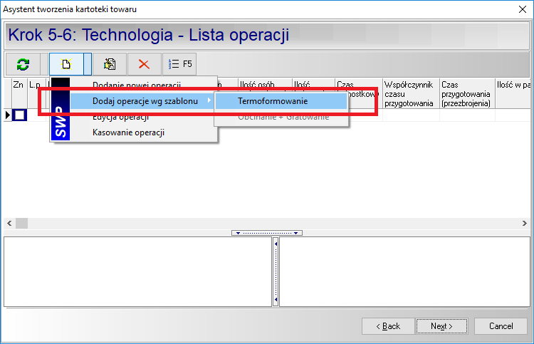 Tworzenie operacji technologicznej na postawie szablonu rozpoczynamy od wybrania odpowiedniego szablonu. W menu kontekstowym dodawania pozycji wybieramy opcję "Dodaj operację wg szablonu".