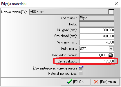 W ten sposób został zakończony proces definicji materiału surowcowego. Należy pamiętać że w liście została zdefiniowana jedynie cena formatki, natomiast faktyczny koszt materiału będzie naliczany dynamicznie w zależności od wielkości partii lub ilości zleconej do produkcji.