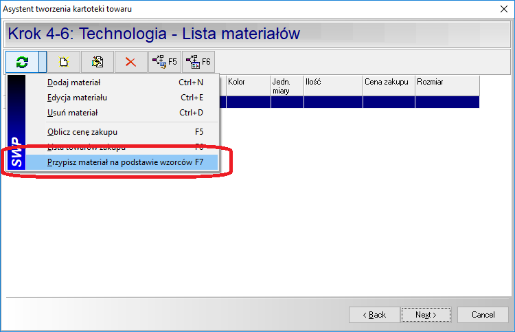 W następnym kroku zostanie wygenerowany materiał w liście materiałów technologii. Jeśli nie nastąpi generowanie automatycznie należy wykonać operację ręcznie przy pomocy klawisza F7.