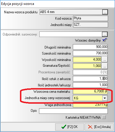 Ostatnią operacją do wykonania będzie wprowadzenie ceny wzorcowej według wagi, oraz ustawienie odpowiedniej jednostki miary ceny wzorcowej. To ustawienie pozwoli na przeliczenie w następnym kroku kosztu materiału na sztukę.