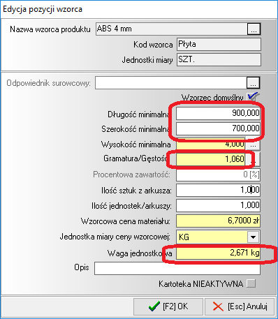 W kolejnym kroku naciskamy klawisz przy tym polu, za sprawą którego nastąpi przeliczenie wymiarów materiału zgodnie z algorytmem. Zostanie również dodana informacja o gęstości oraz zostanie wyliczona waga jednostkowa.