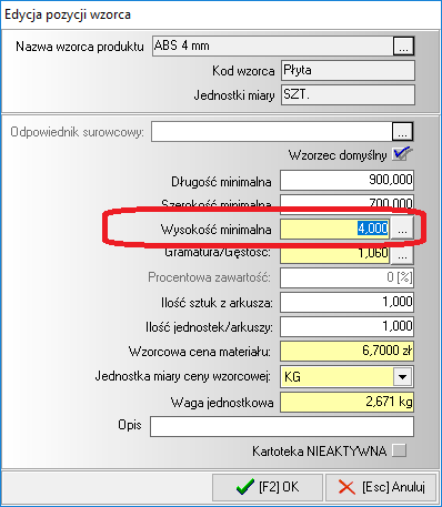 W następnym kroku wprowadzamy materiał surowcowy. Po wybraniu odpowiedniego materiału, należy uzupełnić formularz karty edycji o następujące pozycje. Jako pierwszy parametr wprowadzamy grubość materiału (pole "Wysokość minimalna").