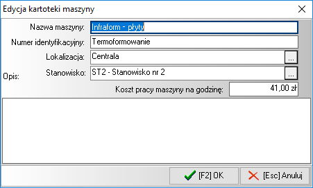 W oknie maszyn technologii należy zdefiniować listę maszyn wraz z kosztem pracy maszyny na godzinę. Ważnym jest aby maszyna miała również zdefiniowane stanowisko, ponieważ przypisanie maszyny do operacji następuje poprzez przypisanie odpowiedniego stanowiska.