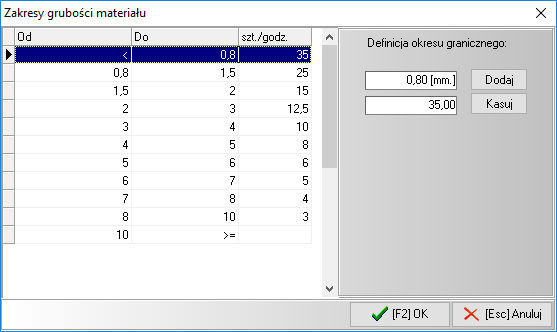 Lista grubości materiałów zawiera zakresy jednostronnie otwarty po stronie parametru "Do". Oznacza to że zakres zawiera parametr "Od", natomiast nie zawiera wartość parametru "Do".