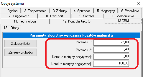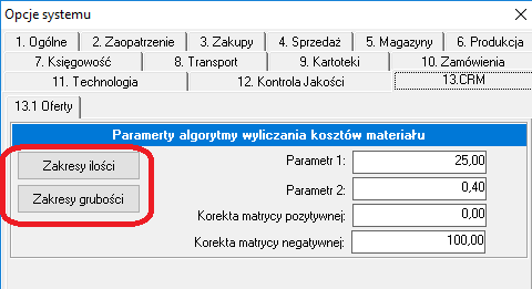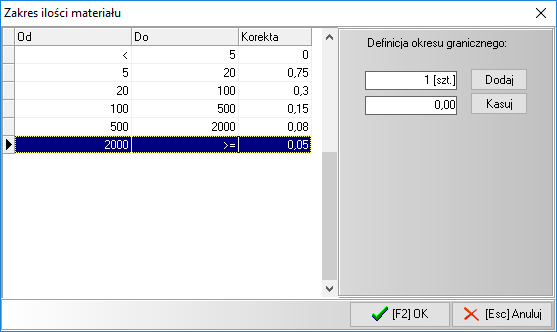 Lista zakresów ilości określa korektę ilościową w zależności od ilości produkowanej. Zakres jest jednostronnie otwarty o parametrze "Od". Co oznacza, że w danym zakresie nie zawiera wartości "Od", natomiast parametr "Do" zawiera liczę w zakresie .