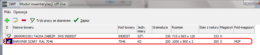 Moduł przeznaczony jest do obsługi inwentaryzacji magazynu zarówno magazynu surowcowego jak i handlowego w trybie off-line. Moduł umożliwia rejestracje towaru w magazynie z natury, bez podłączenia do systemu SWP. Jednak rejestracja odbywa się na bazie kartoteki towarowej systemu, jak i zleceń produkcyjnych systemu SWP. Rejestracja w towaru może być realizowana przy pomocy skanera kodów kreskowych, na podstawie etykiet towarowych lub etykiet towaru gotowego w przypadku magazynu handlowego.