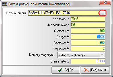 Formularz pozwala na zdefiniowanie takich parametrów jak: Gramatura, rozmiar, pod-magazyn oraz stan z natury. Po zatwierdzeniu pozycja będzie widoczna w arkuszu.