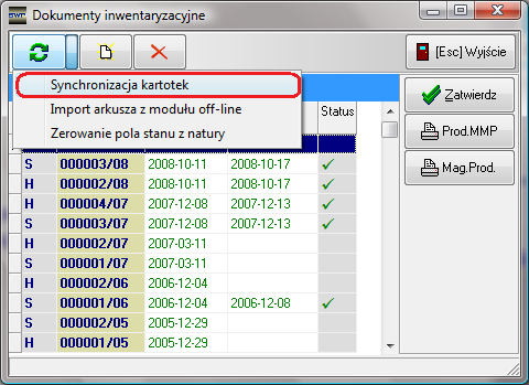 Synchronizację kartotek przeprowadzamy z poziomu systemu SWP. W module inwentaryzacyjnym w menu kontekstowym klawisza odświeżania danych, wybieramy opcję „Synchronizacja kartotek”.