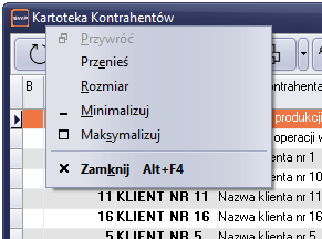 – Pasek tytułowy – jest to belka znajdująca się w górnej części okna prezentująca nazwę uruchomionego modułu (np.„System wspomagania produkcji ver. XXXX.XX.XX.XX”) lub opis zawartości okna (np. "Kartoteka kontrahentów"). Klikając i przytrzymując lewy klawisz myszki nad paskiem tytułowym, a następnie przemieszczając myszkę można zmieniać położenie okna na ekranie. Podobnie jak przy zmianie rozmiarów, system cały czas pokazuje za pomocą ramki, w jakiej pozycji będzie umieszczone okno po zakończeniu przenoszenia. Zakończenie zmiany położenia okna następuje po zwolnieniu lewego przycisku myszki. „Menu systemowe”, jeśli z lewej strony tytułu okna znajduje się ikona to możliwy jest dostęp do menu systemowego po kliknięciu lewym klawiszem myszy na tę ikonę. Menu systemowe zawiera polecenia pozwalające na przywrócenie okna do jego poprzednich rozmiarów, przeniesienie okna w inne miejsce na ekranie, zmianę rozmiaru okna, zminimalizowanie i maksymalizowanie okna oraz jego zamkniecie. Należy zwrócić uwagę na ostatnia pozycje menu umożliwiającą zamkniecie okna. Pozycja ta napisana jest pogrubiona czcionka. Podwójne klikniecie myszka na ikonę symbolizującą menu systemowe spowoduje automatyczne wykonanie właśnie tej funkcji.