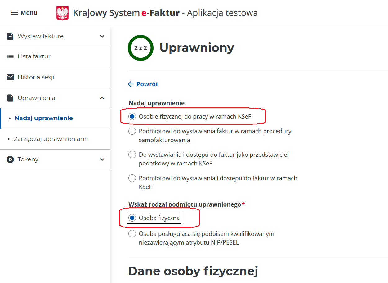 W przypadku dodawania uprawnień dla pracownika firmy, wybieramy opcję „Osobie fizycznej do pracy w ramach KSeF oraz opcję „Osoba fizyczna”. Następnie przewijamy ekran w celu uzupełnienia formularza rejestracji „Dana osoby fizycznej”.
