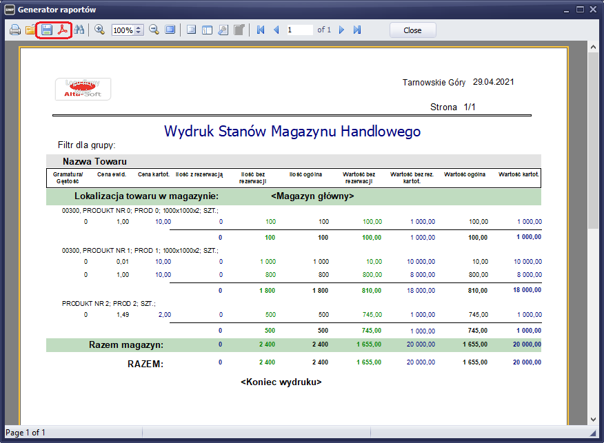 System został wyposażony w nowe mechanizmu eksportu danych. Obecnie generując dowolny wydruk w systemie możemy wyeksportować do pliku typu PDF lub HTML. W niektórych wydrukach istnieje możliwość eksportu również do pliku XML. Aby wykonać eksport danych należy wygenerować wydruk w postaci podglądu i przy pomocy ikony symbolizującej dyskietkę zapisać wydruk do pliku.