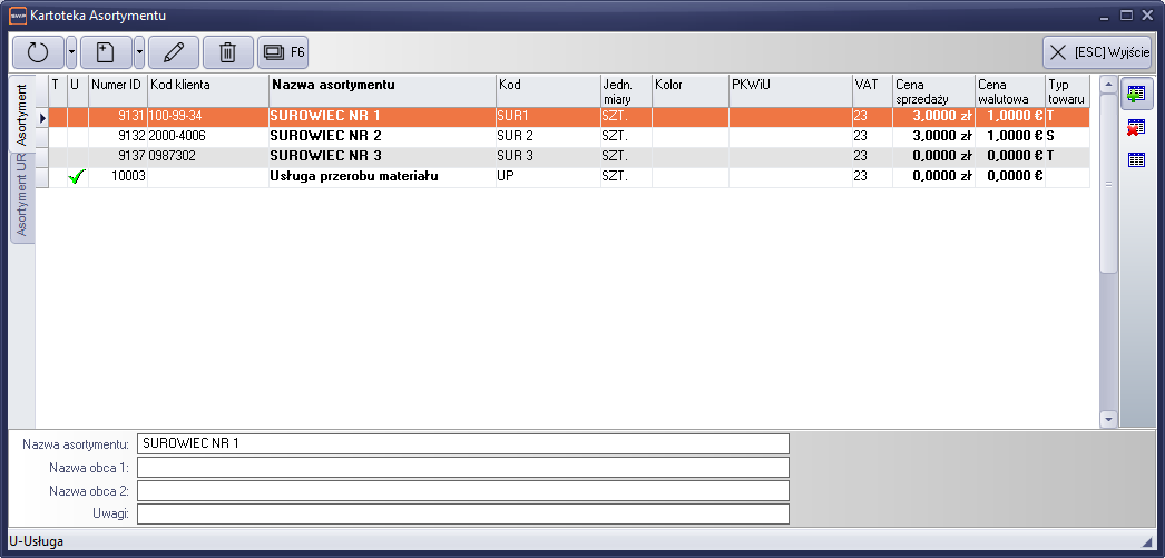 Kartoteka asortymentu, skojarzona jest z magazynem surowców. Kartoteka została umieszczona w głównym menu programu „Kartoteki-> Asortyment”.