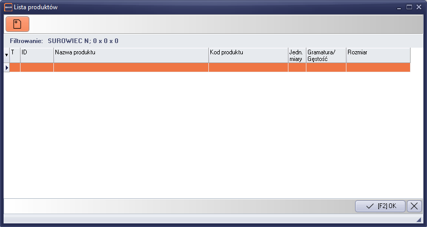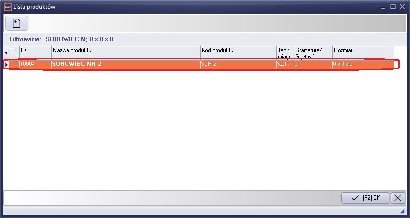 W celu dodania nowego wzorca surowcowego używamy standardowego klawisza "Dodaj [Ctrl+N]". Po uruchomieniu klawisza, pojawi się kartoteka materiałów surowcowych. Następnie wybieramy odpowiedni surowiec i potwierdzamy wybór klawiszem "Enter". Na ekranie pojawi się formularz edycji wzorca produktu z wybraną pozycją z kartoteki surowców.
