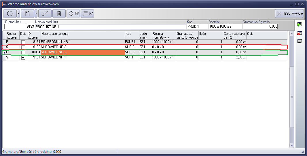 Rysunek 60 Lista wzorców surowców. Materiał surowcowy (ramka czerwona ) i utworzony wzorzec na półprodukt (ramka zielona)