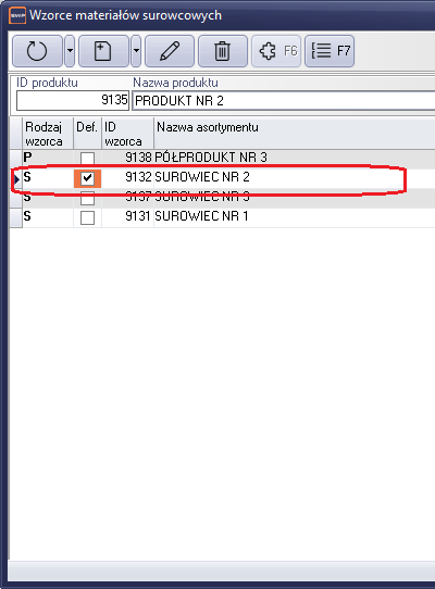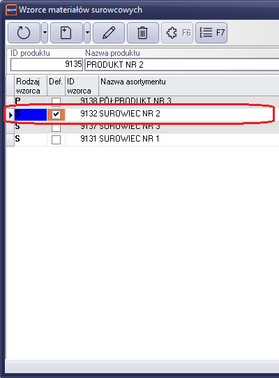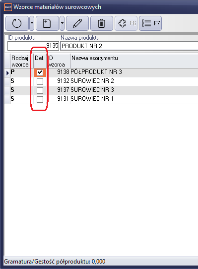 Standardowo system pozwala na ustawienie znacznika bezpośrednio z poziomu siatki danych. Ustawienie polega na kliknięciu myszą danego wiersza materiału surowcowego w kolumnie „Def.” lub poprzez użycie klawisza „spacja”. W ten sposób możemy załączyć lub wyłączyć znacznik domyślny.