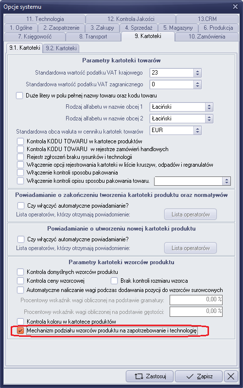 Zmiana sposobu oznaczania znacznika została wprowadzona również w oknie edycji wzorca materiałowego. W tym przypadku ustawienie trybu działania znacznika, realizowane jest poprzez ustawienie listy rozwijanej, wybierając jedną z opcji