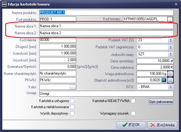 Dodatkowo wybieramy jakie pole nazwy obcej z kartoteki towarowej, będzie przyporządkowane do wybranego dokumentu. Mamy do dyspozycji dwa pola nazwy obcej. Zawartość pól definiowana jest w kartotece towarowej.