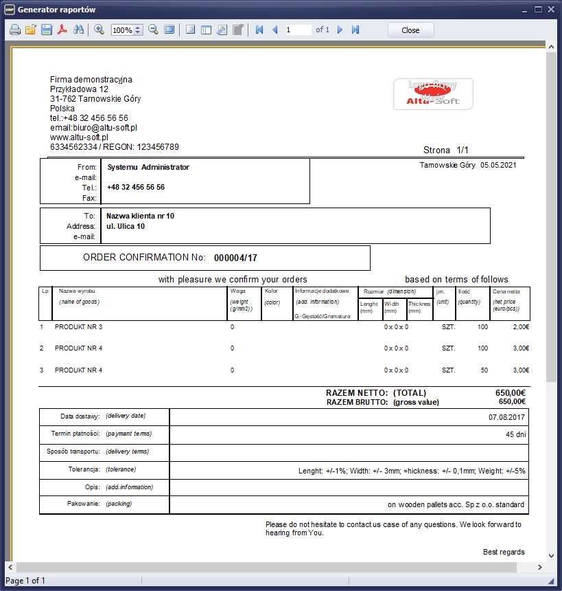 - Wydruk zamówienia.