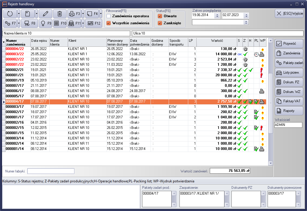 „F7” – funkcja przekazywania do realizacji zamówienia produkcyjnego. Funkcja umożliwia automatyczne wygenerowanie pakietu zadań produkcyjnych. Pakiet tworzony jest na podstawie pozycji zamówienia przeznaczonych do produkcji. Zamówienie może posiadać więcej powiązanych pakietów zadań. Podczas automatycznego wykonania pakietu zadań, system przepisuje pełne ilości zawarte w zamówieniu. Jeśli chcemy przekazać mniejszą ilość do produkcji, musimy wykonać edycję zadania produkcyjnego już po wykonaniu pakietu.