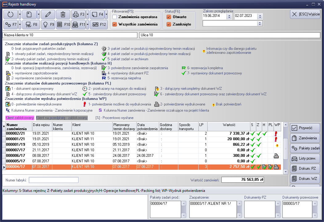 „F4” – informacje poszerzone. Uruchomienie opcji powoduje pokazanie w dolnej części ekranu informacji o uwagach do zamówienia oraz listy powiązań zamówienia z dokumentami zamówień zaopatrzeniowych, dokumentów przychodowych oraz listów przewozowych.