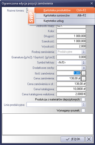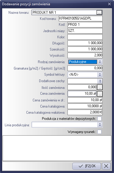 Po wybraniu towaru przechodzimy do wypełniania kolejnych pól edycyjnych formularza. Pole „Rodzaj zamówienia”- jest bardzo istotnym polem, ponieważ od tego wyboru zależy co dalej z tą pozycją będzie systemem w stanie zrobić. W przypadku wyboru „Handlowe” – system będzie realizował sprzedaż , w przypadku „Produkcyjne”, będzie kierował pozycję do produkcji. Pole „Ilość zamówienia” oraz „Cena zamówienia”, są polami wymaganymi w formularzy. W przypadku ceny, w zależności od ustawień odpowiedniej opcji programu, gdy kontrahent jest zagraniczny, cena może być wyliczana w walucie obcej lub w złotówkach.