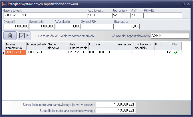 „F7” – przegląd i definicja zapotrzebowania materiału do działu zaopatrzenia. System umożliwia wykonanie zapotrzebowania w sposób ręczny. Dodatkowo w przeglądzie zapotrzebować możemy dokonać potwierdzenia zapotrzebowania.